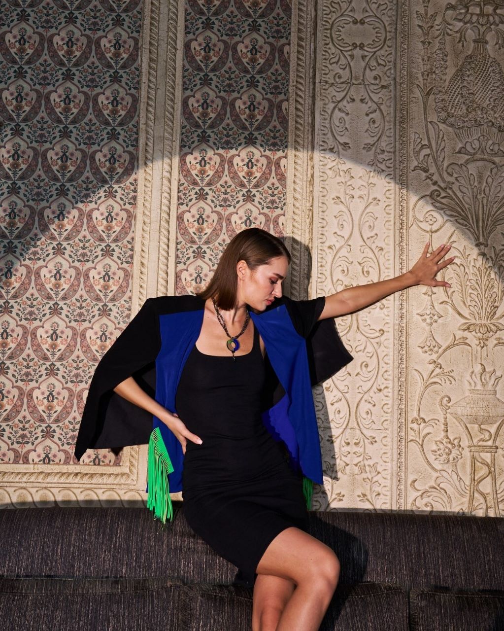 This blue and black formal cape combines the regal allure of blue with the timeless elegance of black, creating a striking accessory for formal occasions.